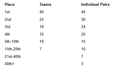 All pairs and teams that are tied in non-payout places will receive the points associated with the tied positon.